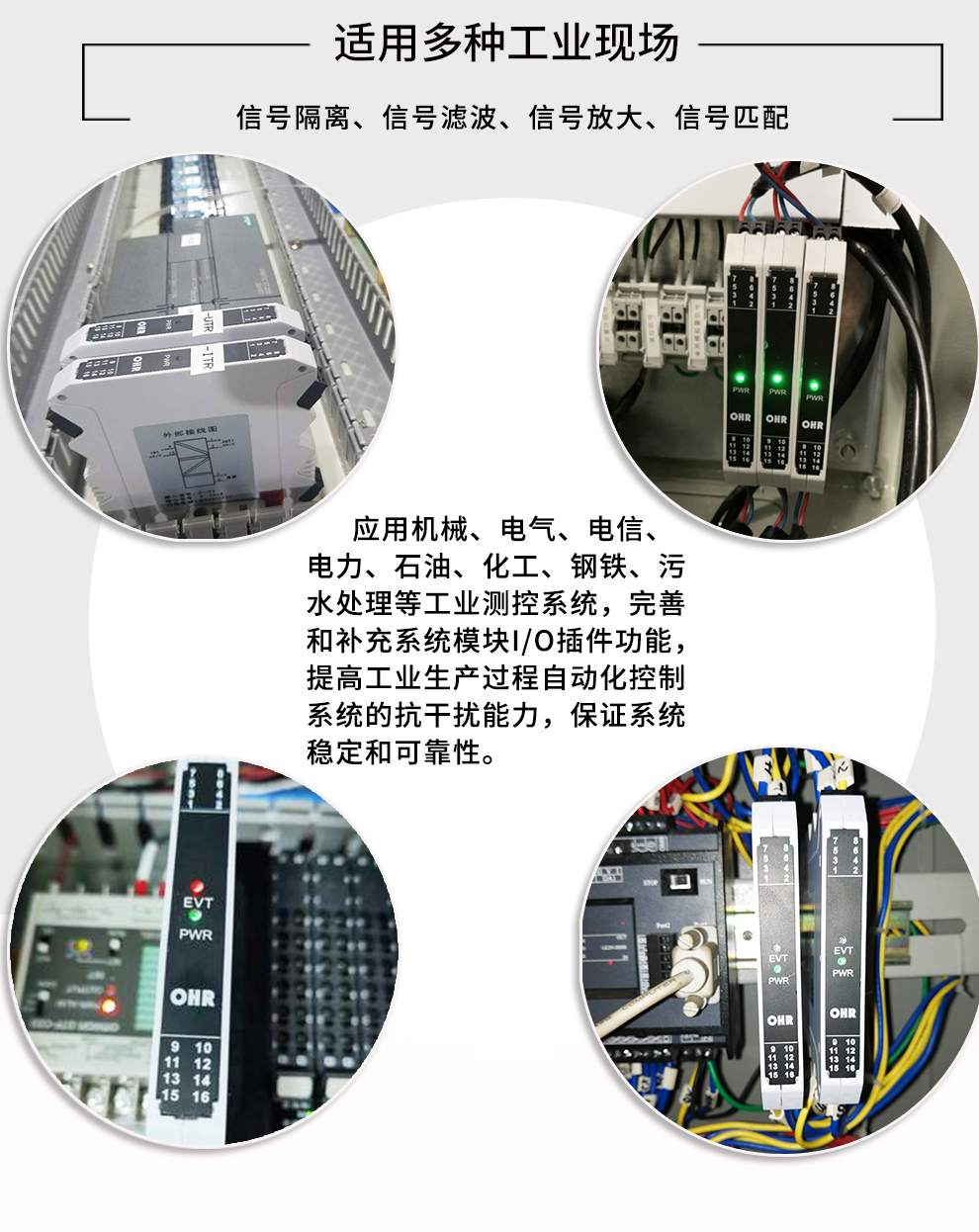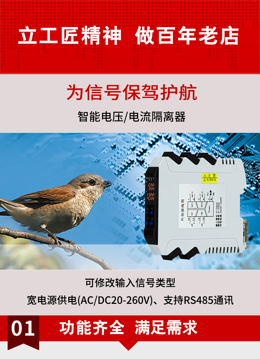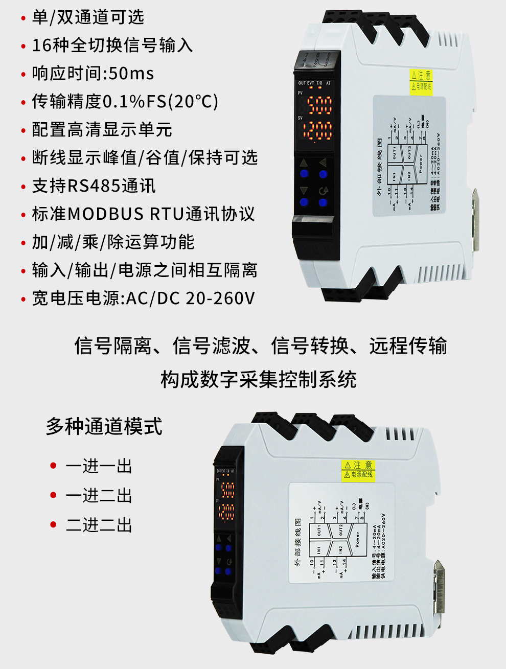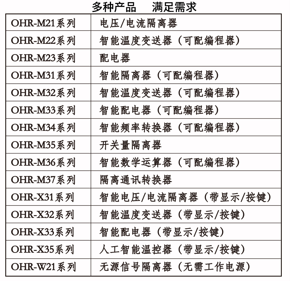 OHR-X31系列導(dǎo)軌式智能隔離器將現(xiàn)場的直流電壓或電流信號經(jīng)過隔離傳送,轉(zhuǎn)換成所需的信號給其它儀表??梢耘cDCS、PLC等系統(tǒng)配套使用,從而提高工業(yè)生產(chǎn)過程自動控制系統(tǒng)的抗干擾能力,保證系統(tǒng)的穩(wěn)定性和可靠性。寬電源設(shè)計:20-260V交直流供電。配置高清顯示單元,通過輕觸按鍵設(shè)置每個通道的參數(shù)及通道之間的切換。高抗干擾、穩(wěn)定性好、可帶RS485通訊