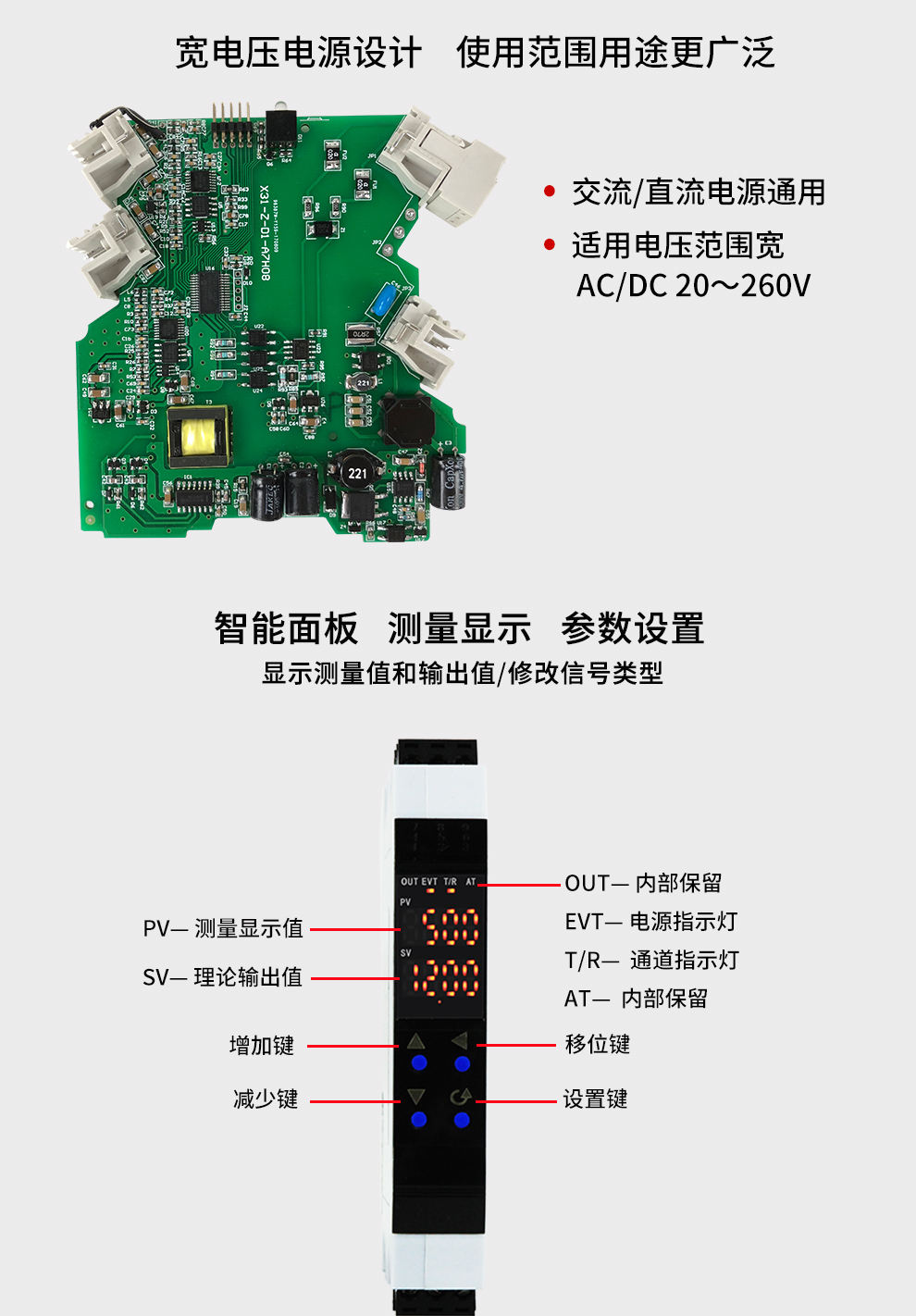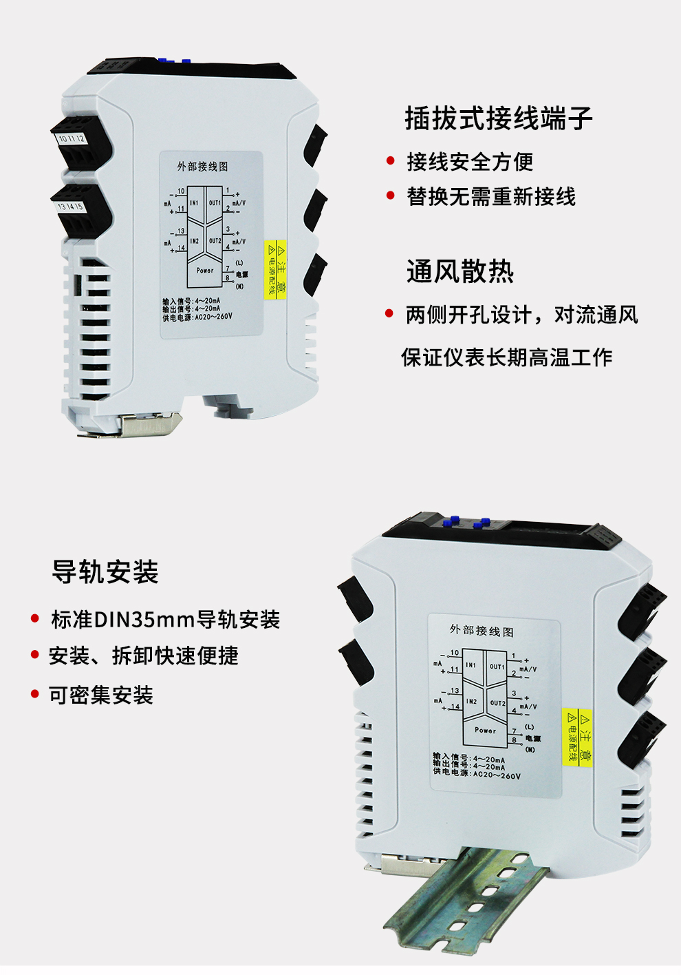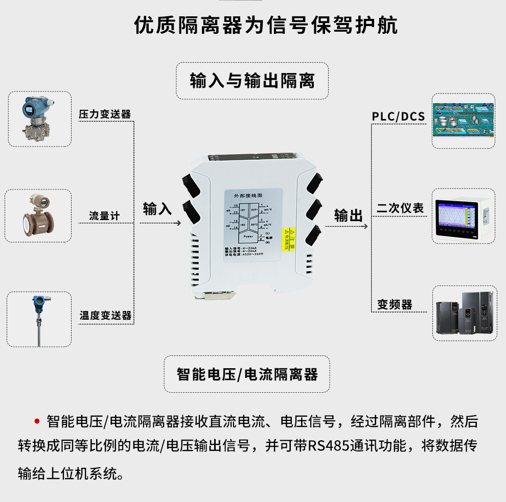 OHR-X31系列導(dǎo)軌式智能隔離器將現(xiàn)場的直流電壓或電流信號經(jīng)過隔離傳送,轉(zhuǎn)換成所需的信號給其它儀表??梢耘cDCS、PLC等系統(tǒng)配套使用,從而提高工業(yè)生產(chǎn)過程自動控制系統(tǒng)的抗干擾能力,保證系統(tǒng)的穩(wěn)定性和可靠性。寬電源設(shè)計:20-260V交直流供電。配置高清顯示單元,通過輕觸按鍵設(shè)置每個通道的參數(shù)及通道之間的切換。高抗干擾、穩(wěn)定性好、可帶RS485通訊