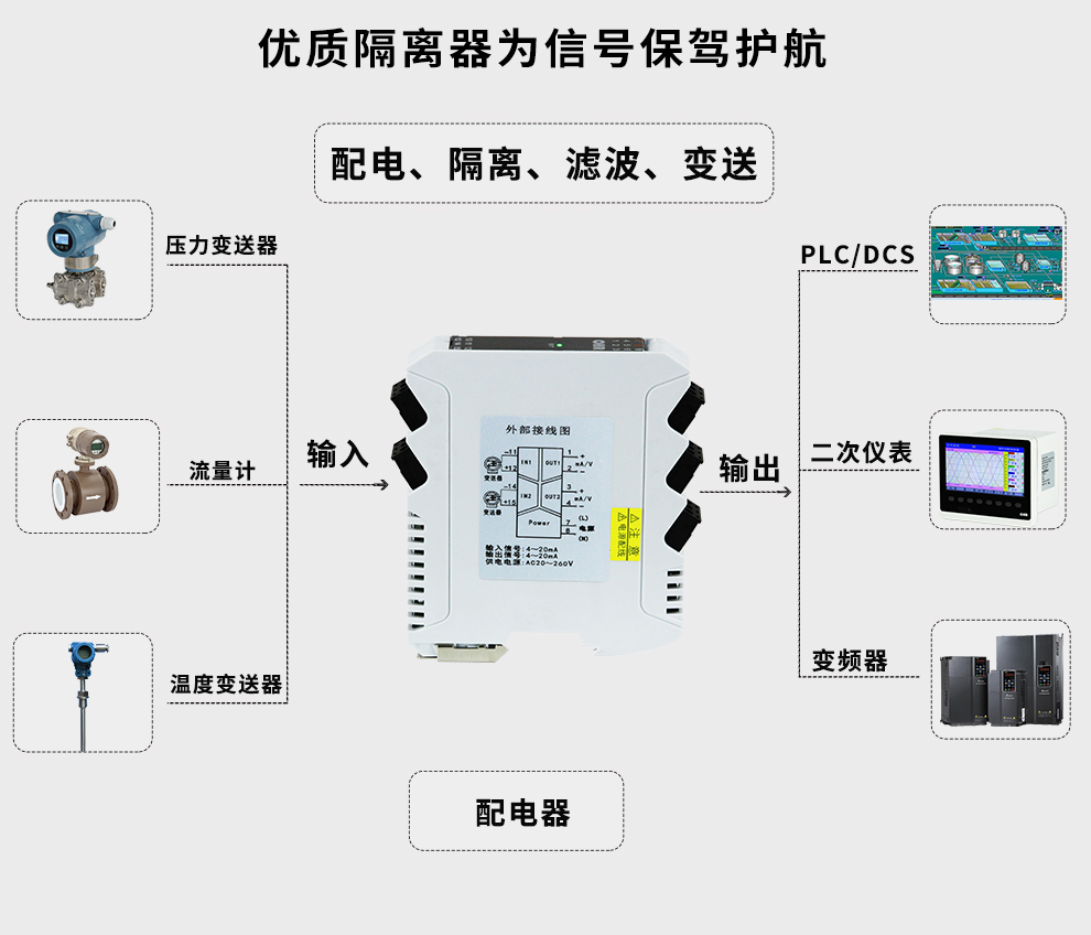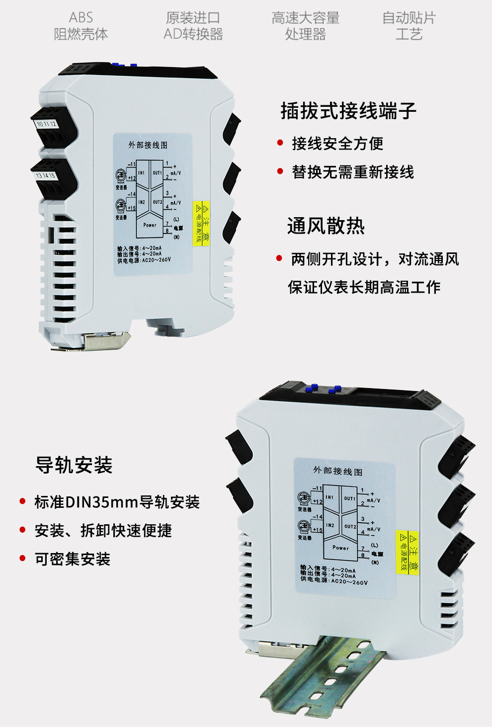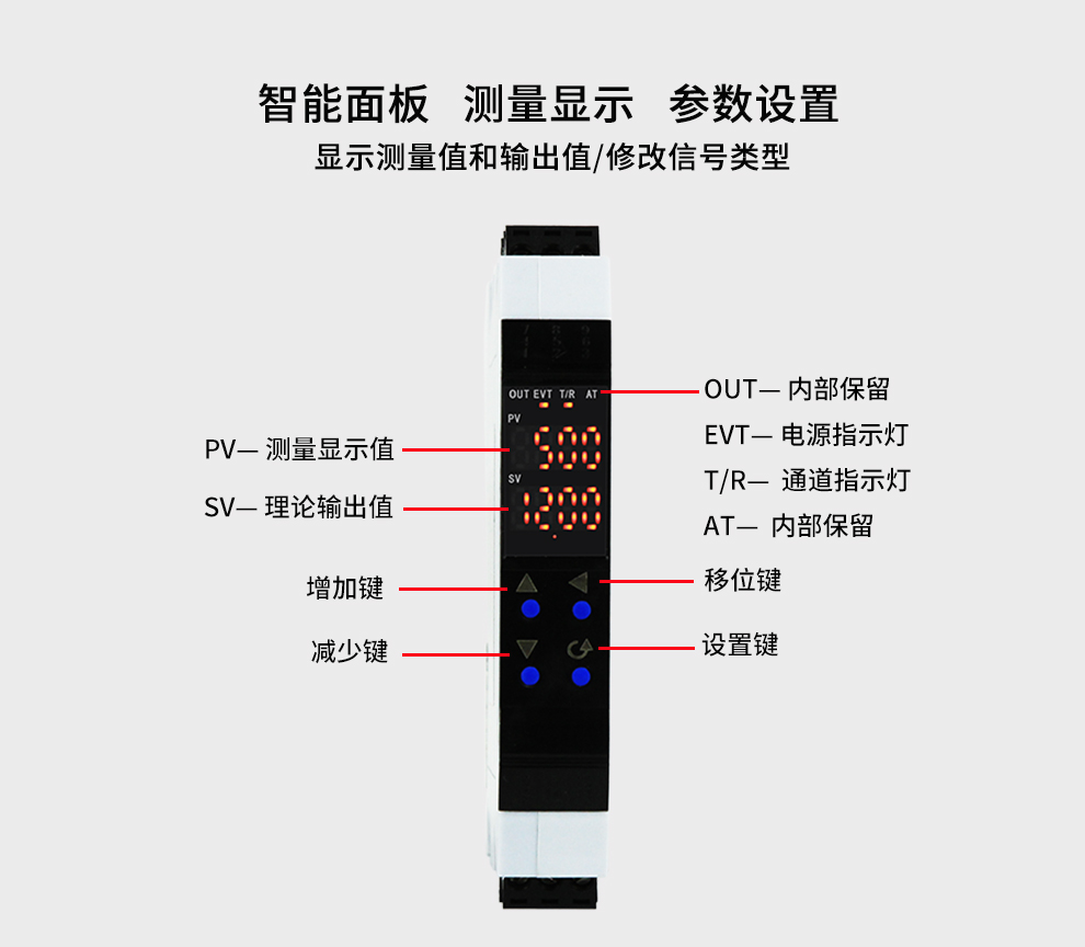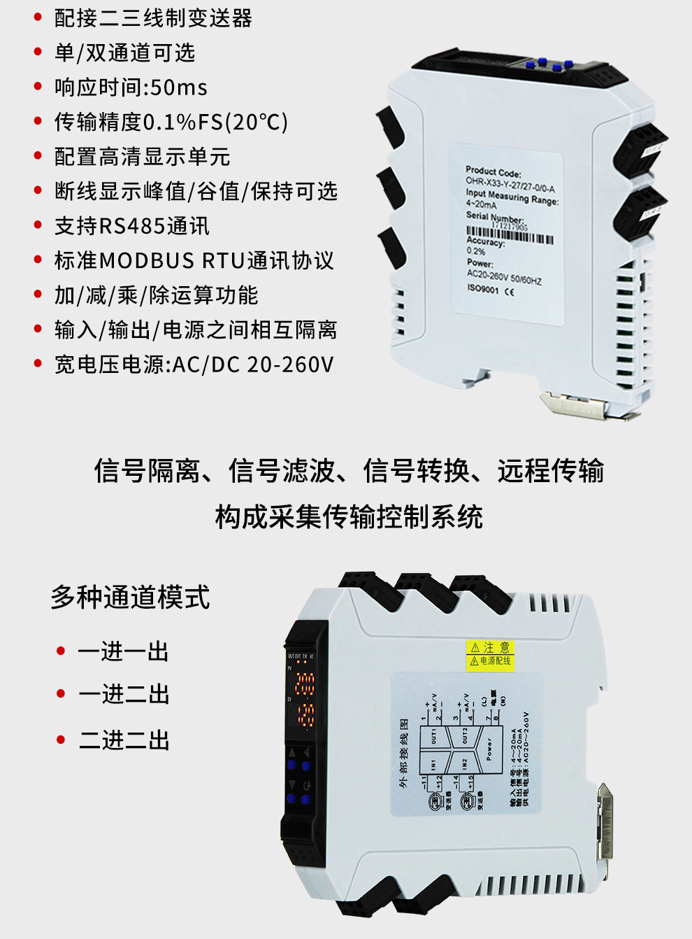 OHR-X33系列導(dǎo)軌式智能配電器給二、三線制變送器提供隔離的電源電壓,將變送器產(chǎn)生的直流電壓電流信號,經(jīng)本隔離器轉(zhuǎn)換成所需的輸出信號至控制系統(tǒng)。寬電源設(shè)計:20-260V交直流供電。配置高清顯示單元,通過輕觸按鍵設(shè)置每個通道的參數(shù)及每個通道之間的切換。