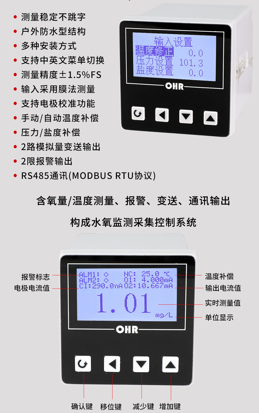 溶解氧測定儀測量穩(wěn)定不跳字,輸入采用膜法測量,可選擇盤裝、壁掛、圓管安裝