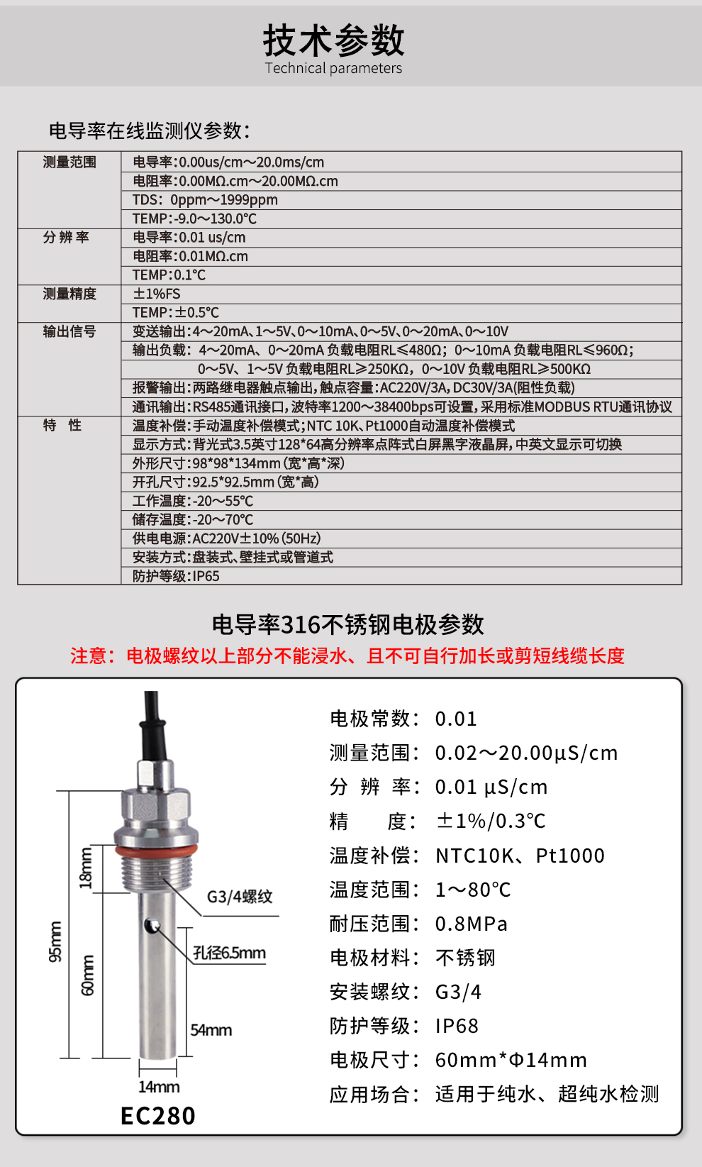 電導(dǎo)率儀測量穩(wěn)定不跳字,豐富的溫度補(bǔ)償模式,可選擇盤裝、壁掛、圓管安裝