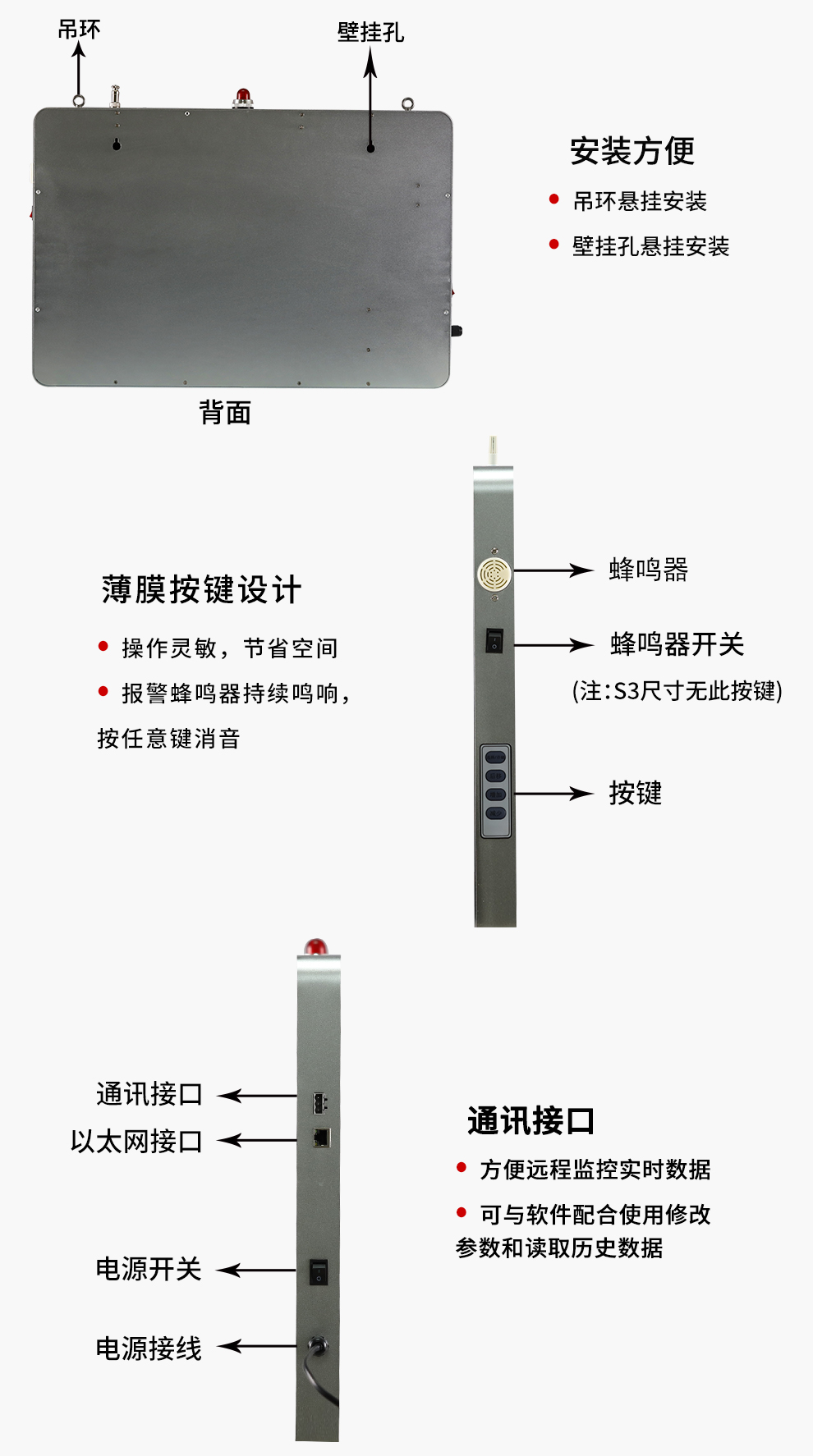 溫濕度變送器/溫濕度控制器/溫濕度記錄儀采用高精度的采集電路及進口傳感器,對環(huán)境的溫濕度進行實時監(jiān)測、報警與記錄。大屏幕LED數(shù)碼管顯示,醒目、便捷,實時顯示溫濕度與時間信息;帶USB2.0記錄讀取接口,通過配套的上位機軟件讀取歷史記錄。該產(chǎn)品適用于倉庫、車間、畜牧業(yè)中室內(nèi)環(huán)境溫濕度的監(jiān)測。