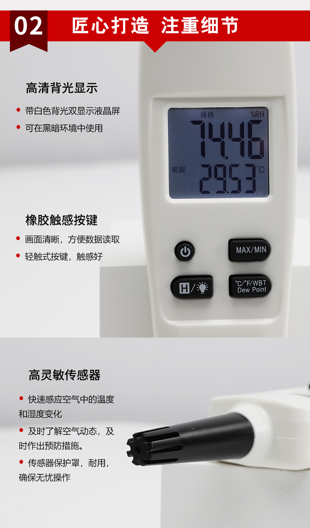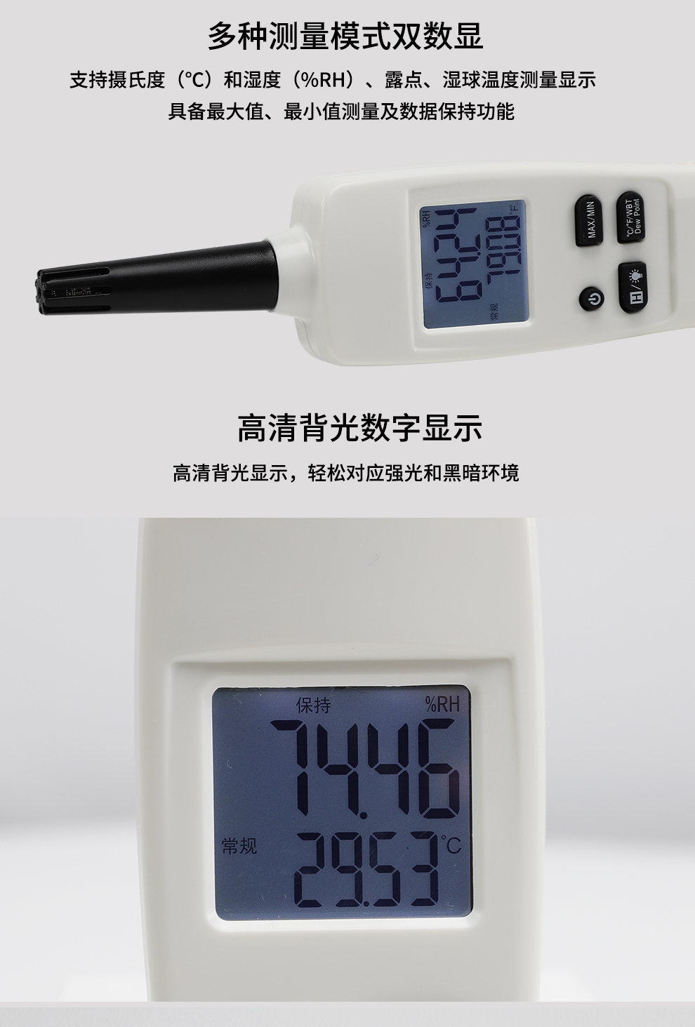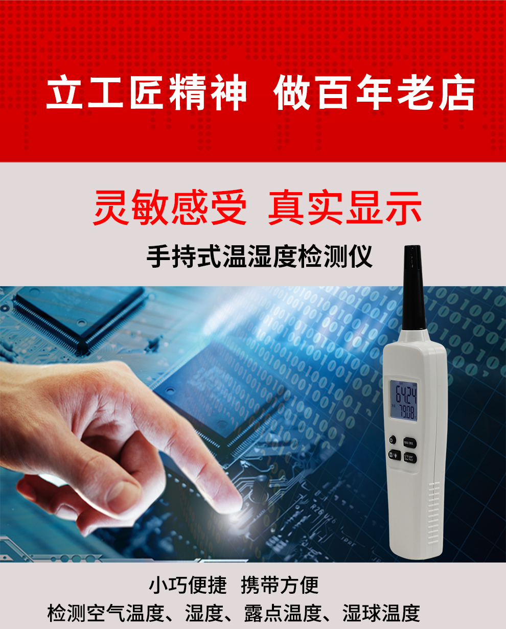小巧便捷,攜帶方便,檢測空氣溫度、濕度、露點溫度、濕球溫度。