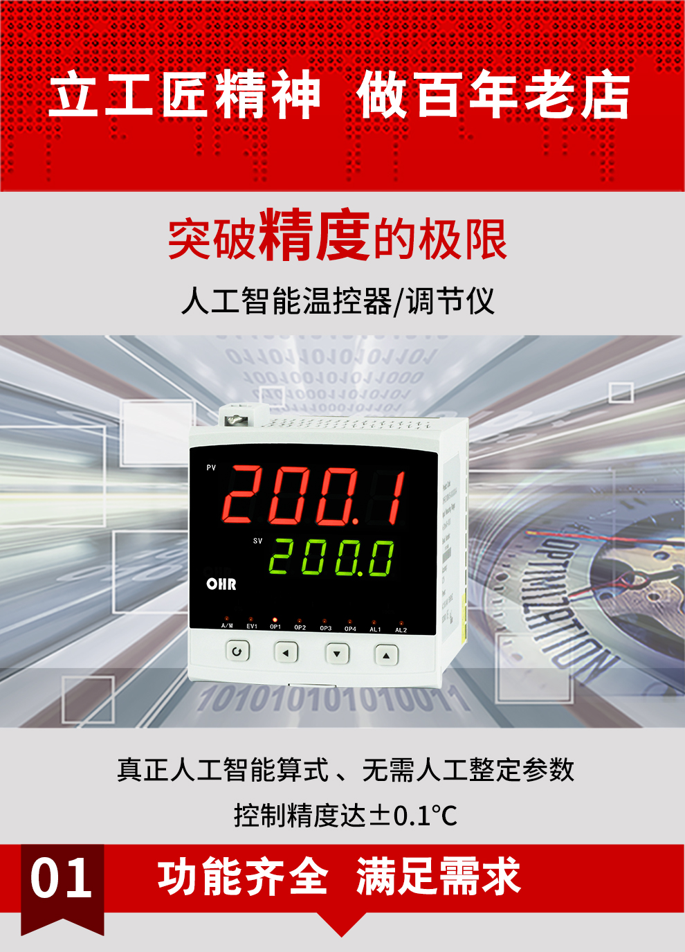 人工智能調(diào)節(jié)儀采用真正的人工智能算式,儀表啟動(dòng)自整定功能,可以根據(jù)被控對(duì)象的特性,自動(dòng)尋找參數(shù)以達(dá)到很好的控制效果,無需人工整定參數(shù)??販鼐然具_(dá)±0.1℃,無超調(diào)、欠調(diào),達(dá)國際先進(jìn)水平。