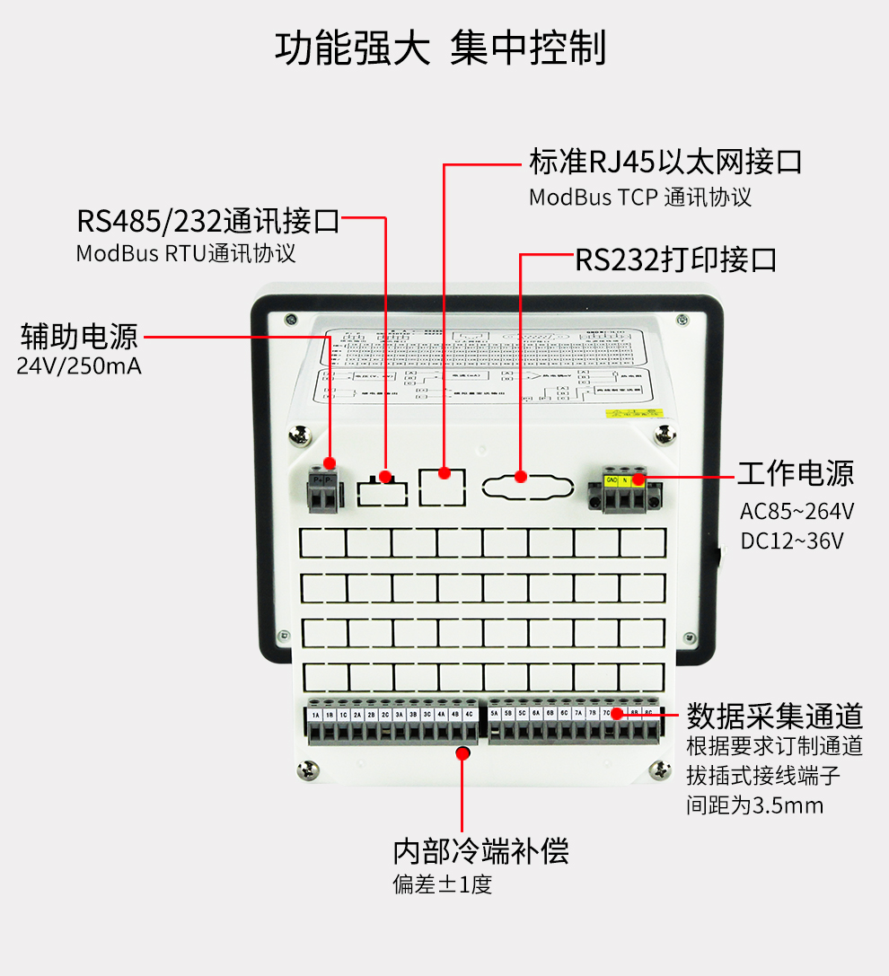 彩色無紙記錄儀/溫度記錄儀用新型大規(guī)模集成電路,對輸入、輸出、電源、信號采取可靠保護和強抗干擾設(shè)計。48路萬能輸入。可帶RS232/485通訊接口,以太網(wǎng)接口,微型打印機接口和USB接口,SD卡插座;可提供傳感器配電;具有強大的顯示功能,實時曲線顯示,歷史曲線追憶,棒圖顯示等。