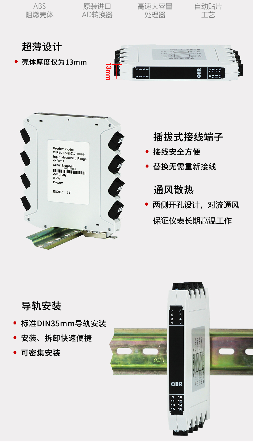OHR-W21系列無源信號隔離器無源信號隔離器無需外供電源,由輸入回路供電,實現(xiàn)信號隔離。可以與各種工業(yè)傳感器、現(xiàn)場儀表配合,取回參數(shù)信號,隔離變送傳輸,滿足用戶本地監(jiān)視遠(yuǎn)程數(shù)據(jù)的需求。本產(chǎn)品品種分為一進(jìn)一出、兩進(jìn)兩出、三進(jìn)三出、四進(jìn)四出,且輸入、輸出磁隔離。