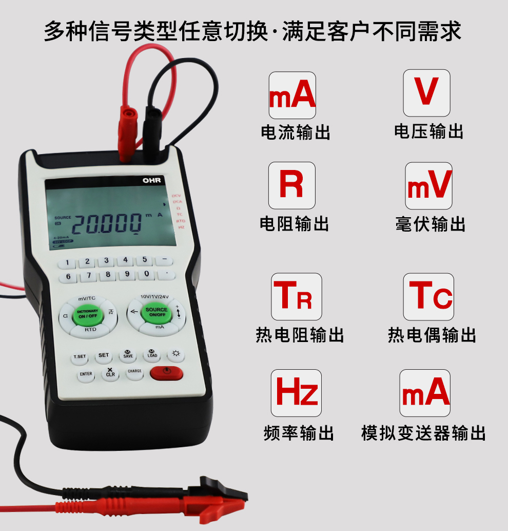 信號(hào)發(fā)生器是一種多功能、高精度便攜式信號(hào)源,可用于輸出各種規(guī)格的工業(yè)信號(hào),支持電流、電壓、電阻、頻率、熱電偶、熱電阻等多種信號(hào)輸出類型,最高精度可達(dá)0.01%F.S,是工業(yè)現(xiàn)場、實(shí)驗(yàn)室以及各類儀表制造商必備的計(jì)量測試工具。