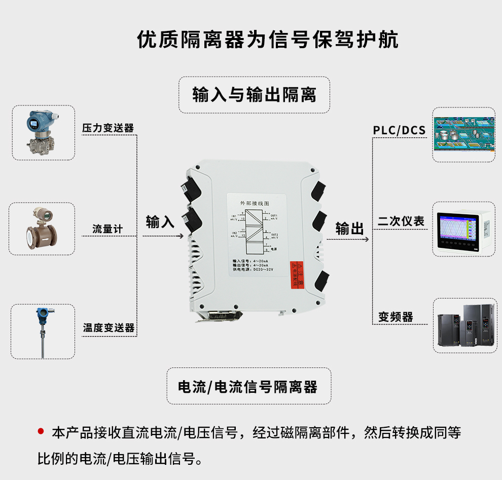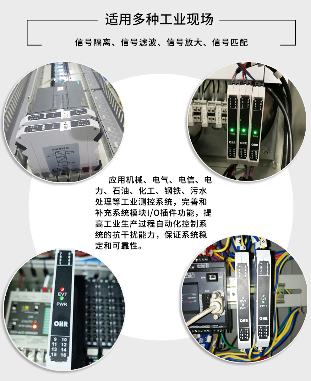 OHR-M21系列電壓/電流隔離器將直流電壓或電流信號(hào)經(jīng)過(guò)隔離傳送,轉(zhuǎn)換成所需的信號(hào)給其它儀表??梢耘c單元組合儀表及DCS、PLC等系統(tǒng)配套使用,給予現(xiàn)場(chǎng)儀表信號(hào)隔離、信號(hào)轉(zhuǎn)換、信號(hào)分配、信號(hào)處理等,從而提高工業(yè)生產(chǎn)過(guò)程自動(dòng)控制系統(tǒng)的抗干擾能力,保證系統(tǒng)的穩(wěn)定性和可靠性。